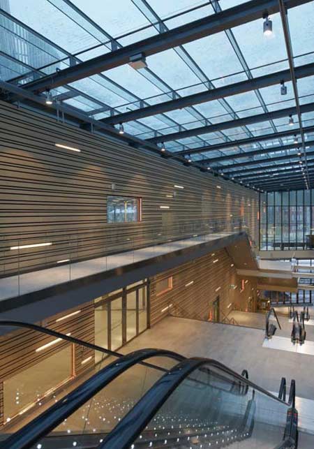 البته لازمه ی دستکاری خط آسمان استکهلم، جلب اعتماد ارباب رجوع و مقامات بود . قسمت بالایی سالن همایش، تماشایی است و با فرمی آزادکه درتعامل با حرکت پل هوایی واسکله های اطراف ساختمان نمایان می شود. مجموعه ی صندلی های سالن بالا، 1,500نفر راجا می دهد و باعث ایجاد ارتباطی آنی با سالن های جداگانه ی اطراف را می شود. جالب ان که قسمت پایینی سالن گنجایش همان تعداد تماشاگر را به سبک سینما دارا است.ازسوی دیگر ،مجموعه ی صندلی های سالن پایین که به سادگی جمع می شود قابلیت ایجاد فضایی برای 2,000 میهمان ضیافت رادارد.
