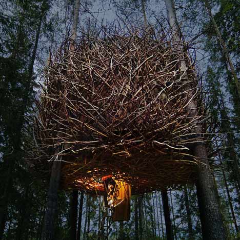 این لانه بزرگ با پله های قابل جمع شدن توسط طراحان سوئدی Inrednin Gsgruppen طراحی و بخشی از یک هتل درختی در شمال سوئد را شکل می دهد . آشیانه توسط درختان موجود حمایت می شود . قسمت بیرونی توسط شاخه های زیاد و فضای داخلی توسط پانل های چوبی پوشیده می شود . پنجره های کوچک و گرد تا حدی توسط شبکه ای از شاخه ها در بیرون پنهان شده اند . ساخت 25 اتاق برای سایت در پنج سال آینده برنامه ریزی شده است . کانسپت طرح بر پایه تضاد بین فضای بیرونی و داخلی است . از خارج ، ساختار مانند یک لانه بزرگ به نظر می رسد ، تنها مقیاس آن را از لانه های مجاور جدا می کند . در داخل ، فضا مانند یک اتاق با استاندارد بالا با طراحی مدرن است که محیطی برای یک خانواده با دو فرزند می باشد . اتاق خواب ها توسط درهای کشویی از هم جدا شده اند .