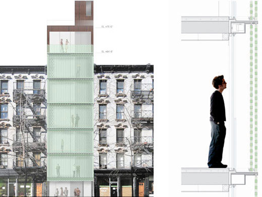 دیلراسکُفیدیو +رنفرو، ساختمان تاون هاوس واقع درشهر نیویورک را طراحی کرده اند.ساختمان هفت طبقه با نمای سیلور، آخرين شكاف باقیمانده میان خانه های دو تایی در محله را به هم متصل نموده است. ساختمان با مساحت 10000 فوت مربع شامل دو آپارتمان دوبلکس، و دوسطح دیگر برای غرفه تجاری روبه خیابان ساخته شده است. به منظور ایجاد نور طبیعی درتعداد زیادی از واحدهاي تنگ و عمیق ساختمان، از سمت شرق که نماي ساختمان در خيابان ديده مي شود ديوار طبقات به سقف شیشه ای متصل میشوند. برای متقاعد کردن محدودیت های محلی(حريم)، دیوار پرده ای توسط سیستم صفحه شيشه اي مشجر اِجرا شده است.آجرهاي شيشه اي سفارشي در يك الگوي همبند و متداوم با فضاهاي پُر و خالي شطرنجي بر روي ميله همانند مهره هاي آويزان شده نماي ساختمان را جلوه بخشيده است. از سمت روبه روي ديوار شيشه اي در سقف تمام طبقات بندكشي ستوني انجام شده است. اين بافت سنگين صفحه ميتواند به صورت خودكار توسط مصرف كننده مكان(مستاجر) همانند پرده هاي مجلل و بزرگ كشيده (باز و بسته) شود. روشنايي و چشم انداز را ميتوان به وسيله همپوشاني ديوارهاي آجري و تغييرابعاد و اندازه ي فضاهاي پُر و خالي شطرنجي تنظيم كرد. طبقات روبازموجود در داخل اختمان براي مبلمان و به حداكثر رساندن كاربري فضا توسط ديوارهاي متحرك جدا كننده و درك فضايي از واحدها، مورد استفاده قرار ميگيرد.