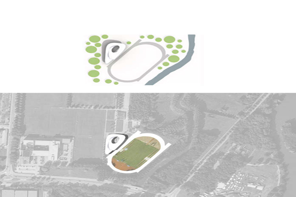 ساختمان یک ورزشگاه طبقاتی مارپیچ است که مانند دیگر ساختمان ها کف هر طبقه , سقفی است برای طبقه پایین تر.جایگاه تماشاگران در حاشیه طبقات به صورت ادامه دار قرار گرفته است.این ساختمان به خودی خود می تواند بک آرم ورزشی نیز باشد.