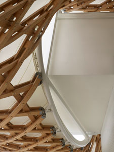 مرکز پومپیدو – متز در فرانسه توسط معماران شیگرو بان از ژاپن و Jean de Gastines از فرانسه طراحی شده . ساختار سقف با چوب های چند لایه و موجدار ، اطراف یک منار فلزیِ 77 متری را گرفته . چهارچوب با فایبرگلاس های شفاف و پوششی از بافت تفلون ، پوشیده شده و تا ارتفاع 20 متر ار بالای دیوارهای ساختمان آویزان است . ساختمان با 5000 مترمربع فضای نمایشگاه توسط دو باغ و تراسی با شیب آرام احاطه شده .