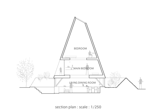 خاک های باقیمانده از حفاری زمین را برای ساخت یک تپه به کار بردیم،با این کار علاوه بر اینکه فضای سبزی برای این خانه می ساختیم،دیواری برای حفظ حریم شخصی این خانواده نیز ایجاد می کردیم.طبقاتی که بالاتر از سطح زمین قرار دارند با سقفی حرمی شکل طراحی شده و نور این خانه هم از پنجره های سقفی تأمین می شود.