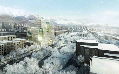 این ساختمان محل تقابل گذشته،حال و آینده است،جایی که مقرنس ها،گنبد های انفعالی و صفحات مدرن با تکنولوژی بالا در جهت احترام به قدمت و معماری پارسی با هم کار می کنند. سالن اداری مملو از نور و هواست،از نفس کشیدن در محیطی با چشم اندازی از کوهستان لذت برده و بگذارید فضای کاری انعطاف پذیر با عملکرد بالا خود را نشان دهد.پیشرفته ترین بخش کار طراحی سالن عمومی بی نظیر،پایدار و انعطاف پذیریست که به منظور برنامه های اقتصادی کشور طراحی شده و بسیار در این کار بارز است.