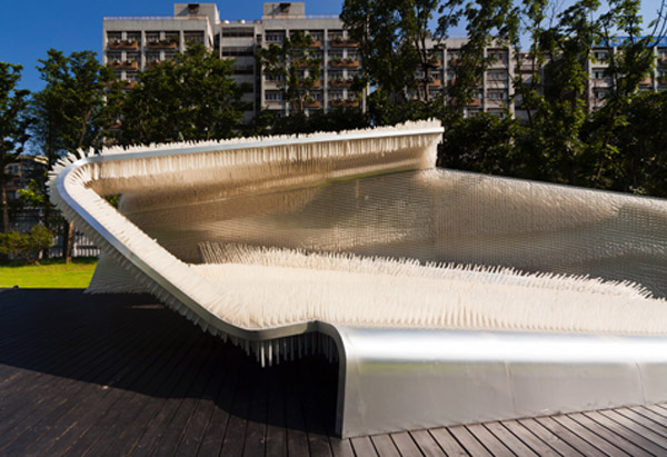 این شکل مواج به منظور برانگیختن یک حس کنجکاوی درباره ی ساخت, کاربرد, لمس پذیری, مصالح و ترویج فرم های متفاوتی از برهم کنش ایجاد شده است. عناصر با تمی تعامل برانگیز در ذهن که تداعی کننده یک دیوار ساده که هم به مثابه یک قلم مو و هم در جایگاه نیمکت هایی که به عنوان نشیمن گاه عمل می کنند,طراحی شدند. در مرکز اینستالیشن یک عنصر میز/تخت مانند, در زیر سایبانی معلق از شاخک های راست شده قرار گرفته است.