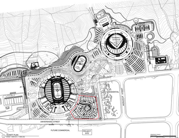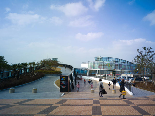 این پروژه در فرایند رقابت برای باز زنده سازیِ یک پارکینگ- که در گذشته مورد استفاده بوده- درست در مجاورت استادیوم جام جهانی دایِِگو(Daegu)ریشه دارد. ژِرده(Jerde) مامور شد، تا بر مبنای کانسپتی برای [پرداخت] آیکونیک و تکه تکه -موزاییک وار- سطوح و فرم های ارگانیک، برگرفته از صنعت نساجی شهر دایگو، طراحیِ این پروژه را انجام دهد. این طرح بیشتر تحت تاثیر استادیوم یاده شده در مقام نمادی برای وحدت جهانی است. این رویه ی تکه تکه ی - موزاییک وارِ- فضای جدید، به مثابه ی یک استعاره به منظور در هم آمیزیِ فرهنگ های مختلف جهانی نقش آفرینی می کند، که از این قلمروی جدید اجتماعی و چرخه ی مرکزیِ تفریحی آن را شامل: نمایشگاه، غذاخوری و فعالیت های ورزشی، را بازدید خواهندکرد.
