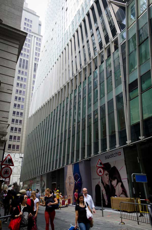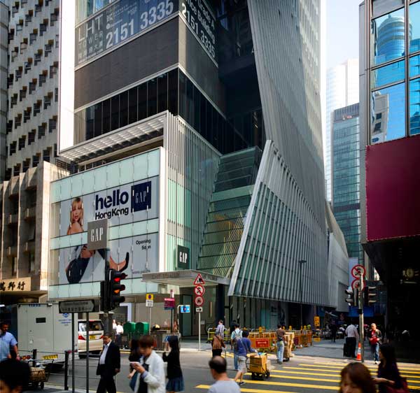 در این طرح با توجه به چالش[طراحی] بین یک برج استاندارد و رویکرد توسعه ی ساختمان منفردِ پودیوم و همچنین قربانی نکردنِ ارزش های اقتصادی پودیوم فروشگاهی، سیستم نمای فولدینگ و پویا در ضلع کشیده ی شرقیِ ساختمان، پودیوم و برج را در یک تسلسل فرمال می پوشاند. در سمت غربی، نمای دیوار شیاردار به همراه ریختِ بام؛ گستره ی این دیوار یکی شده را فرم می دهند، و برنامه ی عملکردها، بواسطه ی این دو پوسته ی فولد، دو کاراکتر مختلف شهری را در جوار این سایت مشخص می کند. این ساختمان خود را به مثابه ی یک لندمارک شهری معرفی می کند، که نقطه ی آغازیست برای مجموعه ی بناهای پیوسته ی قدیمی با خیابان باریک جلوی آنها که به کویینز رُود سنترال از غرب ختم می شود و ساختمان های اداری معاصر که در شرق آزادانه برپا هستند. در پاسخ به آمد و شد زیاد در امتداد تئاتر لِین، پله ی متحرک برای طبقات فروشگاهی در نظر گرفته شده که بطور استراتژیک جنب پیچشِ پوسته ی شیشه ای قرار گرفته تا نمایی درگیر و محرک را شکل دهد و همچنین از ایجاد دیواری خالی و ناخواسته برای پس زمینه ی مسیر پیاده، که در گذشته متعلق به ساختمان سینمای سابق بود، اجتناب شده است.