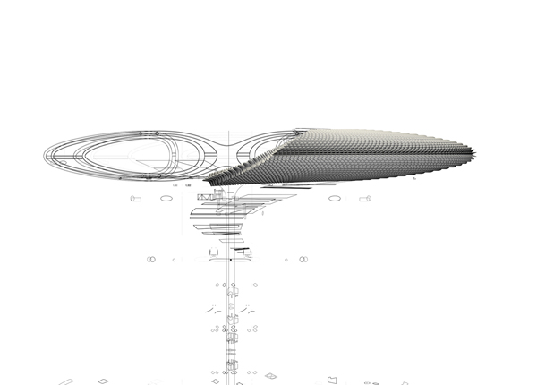سلول های زندان آینه ی نوری نیمه شفاف را ارائه می دهند و چشم اندازی از دریا را به سلول ها تحمیل می کند و تصویری از طرح یک فضای باز را فراهم می آورد. حلقه های ممتد سلول ها وزن را به طور مساوی در سرتاسر رمپ معلق توزیع کرده است. آب اقیانوس از طریق صفحات روکش شده پمپ می شود و زندان را به عنگام عمل توربین ها پنهان می کند.