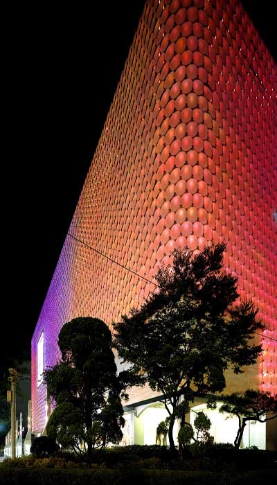 از آنجا که پولک های شیشه ای نسبت به زاویه و میزان انعکاس نور و رنگ، حساس می باشند، در روز پوسته خارجی بنا با تغییرات اقلیمی و تغییر نور روز تغییر رنگ می دهد و این پدیده بدون مداخله و کنترل انسان صورت می گیرد. اما در شب، با توجه به حساسیت صفحات شیشه ای نسبت به نور، مداخلات مختلفی از طریق پرژکتورهایی که توسط کامپیوتر کنترل می شوند صورت می گیرد تا به جلوه های دلخواه و نمایشی دیدنی دست پیدا کنند. نمای ساختمان مانند یک صفحه نمایش معمولی عمل نمی کند؛ بلکه نسبت به نورهایی که به آن تابیده می شود عکس العمل نشان می دهد. این نورها می توانند حاصل تصاویری باشند که در نور روز فیلم برداری شده اند و یا نور مصنوعی.