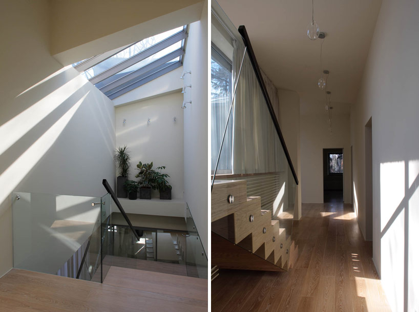 در این فرایند پلان درخت های غان، بلوط و کاج پیرامون و یکپارچه را احاطه کرد. تیم طراحی تا جایی پیش رفتند که یک لوله ی بتنی ویژه را در شالوده برای حفاظت از ریشه ی یک درخت ایجاد کنند. در حالی که حجم ها از شالوده رشد کردند. این خانه به دقت با حوزه ی عمومی و خصوصی با تأکید بر رنگ و مصالح ترکیب شده است. ما به ازای بتن مسلح بیرونی تک رنگ سنگ مرمر سفید در فضای داخلی قرار گرفته و با کانال هایی از سنگریزه و مبلمان توکار سیاه رنگ نقطه گذاری شده است.
