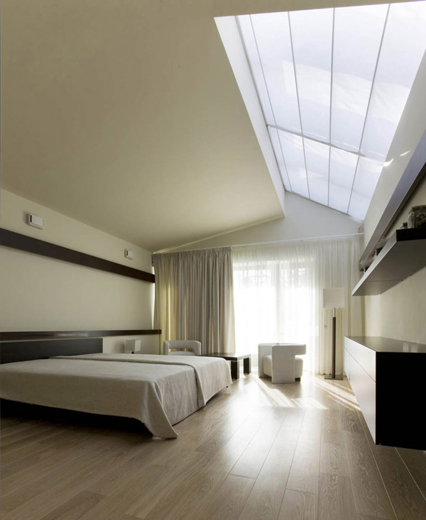 انبار شراب با آینه های شیشه ای رنگ شده و پیچیده در چوب تیره و کوریان بسط یافت. به شکل متضادی بیشتر بخش خصوصی در مصالحی با رنگ گرم تر پیچیده شده است. پنل های بلوطی و بافتی کرمی رنگ در اتصال با نوار پنجره رو به آسمان در تولید اتاق خواب و حمام های خالی به کار آمده اند. سقف شیب دار خانه در واقع یک قطعه ی تک وجهی است و برای آفتاب گرفتن و یا پیکنیک قابل دسترس می باشد. در حالی که روزنه های انتخاب شده را برای روشنایی فضای داخلی ارائه کرده است.