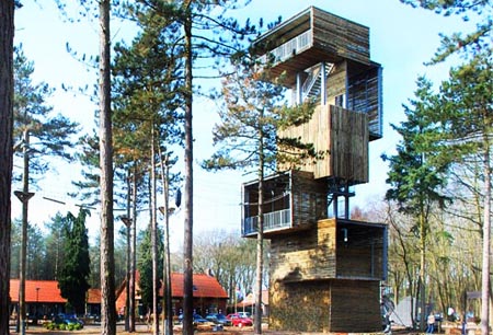 ما در روز تعداد زيادي خانه هاي درختي مي بينيم، ولي هيچ يك از انها جعبه مانند و مدرن ، مانند اين برج ديدباني چوبي جديد كه اخيرا در هلند افتتاح شده نيستند. بنابراين ساختار فني ساختمان كه شامل 6جعبه(كه تقريبا شبيه به جعبه هاي حامل بار در ناوگان ها است) كه بر روي يكديگر انباشته شده اند ، شبيه به يك خانه ي واقعي نيست، ولي پوششي كاملا طبيعي كه به واسطه ي نيمي از سطح مقطع كنده هاي چوبي احاطه شده ، دارد كه كمكي است به تركيب بنا با درخت هاي همجوار خود. و سرانجام ، الان كه ساختمان جعبه مانند توسط گروه معماري اتليرن Ateliereen Architecten گشوده شد، مردم ميتوانند مقياس پوسته ي سنگي بالا رونده و چشم انداز ان را امتحان كنند و يا حتي (براي كساني كه ماجراجو هستند) امتحان كردن سر خوردن با طناب كار هيجان انگيزي است. بلندي ارتفاع خانه درختي 25 متر است ، برج چوبي توسط اسكلتي فولادي و پلكاني براي بالا رفتن از بين مكعب ها پشتيباني مي شود.تنها 2تا از اين 6 مكعب قابل دسترس هستند،و يكي از انها سكويي است براي طناب لغزنده و خط سير ان. در قسمت بالاي جعبه مردم ميتوانند منظره ي زيبايي را تماشا كنند،يا اگر شجاع هستند براي فرود امدن يا rappelling تلاش كنند. اگر كسي به سبب فعاليت هاي فيزيكي گرسنه شود ميتواند از اغذيه فروشي كه تقريبا در مجاورت ساختمان قرار دارد استفاده كند.
