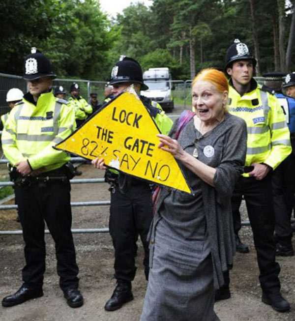 طراح مد ویوین وست وود حفاری گاز شیل را محکوم کرد, و در این راستا به معترضان ضد فرکینگ در اردوگاهشان در دهکده ی بالکوم ملحق شد. او در سایت اکتشافی شرکت گوادریلا در ساسکس غربی که نقطه ی تلاقی معترضان فرکینگ بود, راهپیمایی کرد. حداکثر 1000 معترض بعلت اصلاح شش روزه کمپ انرژی حومه ی دهکده به منظور نشان دادن مخالفت خود با روش بحث برانگیز استخراج این شرکت به هم پیوستند.