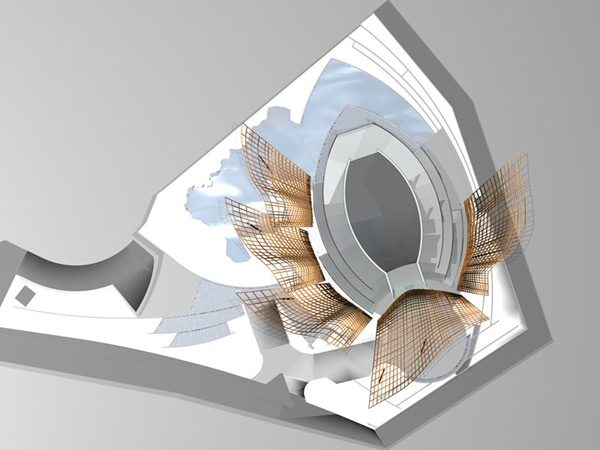 این برج ملهم از مشعل المپیک سیدنی و برج کیو وان استرالیا می باشد. و از ساختمانی عمدتاً لعاب شده و با استفاده از یک سیستم تخمکدار مشابه گلبرگ گل رز برای مقابله با هر گونه نوسانات شدید دمایی متأثر گردیده است. پایه ی برج با یک سایبان چوبی با ظرافت در تفکیک نمای لعاب دارِ منظم ترکیب شده است. سایبان از ساختار قایق های تجاری عربی به ویژه پوسته ی قایق تأثیر پذیر بوده، دیگر کارکرد این سایبان در جایگاه یک میانجی برای تفاوت های دمایی فضای داخلی و خارجی می باشد، که برای فضای خارجی به عنوان سایبان نمود یافته است.