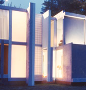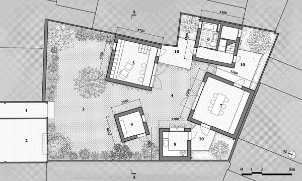 در ساختار غیر متداول سایت خانه، این پنج حجم بتونی در اطراف یک باغ مرکزی اصلی قرار گرفته اند و باغ های کوچک و به هم پیوسته ای را ایجاد نموده اند. در طبقه همکف، درهای شیشه ای گسترده و پنجره های متحرک بزرگ طراحی شده اند تا از تهویه مناسب و نور کافی هر قسمت از این خانه ی مسکونی، اطمینان حاصل گردد؛ در حالیکه حریم خصوصی و امنیت ساکنین نیز حفظ گردد.