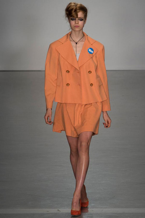 وست وود با غرور حمایت خود برای استقلال اسکاتلند را در ران وی " برچسب قرمز" اعلام کرده است. در جایگاه یک آنارشیست، او به ما قدرت مد را که می تواند حامل چنین پیامهای سیاسی باشد، یادآوری می کند. در این مورد موضوع مربوط به ارائه ی امکان سوق اسکاتلند به آینده ای نو بود.