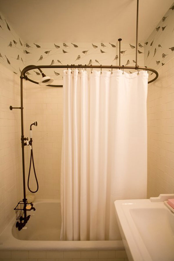 یک وان کوچک، بهترین راه برای یک حمام تنگ است. از یک پالت تک رنگ و کاغذ دیواری برای باز کردن فضا و اضافه کردن جذابیت استفاده کنید.