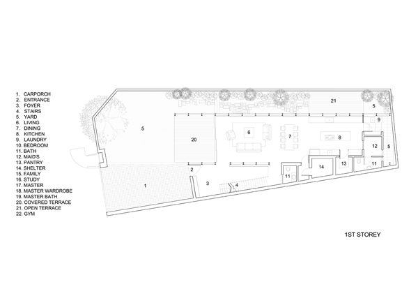 در مقابل این خانه، تراس محصوری با ارتفاعی معادل دو طبقه از خانه قرار دارد که دیواره ی آن از یک قفسه ی کتاب متمایز ساخته شده است و به ارتفاع دو طبقه از خانه گسترش یافته است. پلان آزاد طبقه ی اول این خانه ی مسکونی دارای پنجره هایی از کف تا سقف می باشد که به صورت کشویی رو به یک باغ سرسبز در کنار ساختمان باز می شوند.