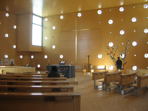 داخل این ساختمان کوچک برخلاف بیرونش (که سرد و فلزی بود) ، گرم و چوبی بود. کمی دقت کردم. مراسمی به پا بود. نیمکت های چوبی و ... بله ... یک فرد مذهبی برای نوزادی دعا می خواند....من هم آرام روی یکی از نیمکت ها نشستم. کلیسای زیبایی بود. همه چیز با وسواس طراحی شده بود. تعداد زیادی پنجره های دایره ای شکل کوچک نور طبیعی و آفتاب دلچسبی را به داخل هدایت می کرد. مبلمان طراحی زیبا، ساده و فکرشده ای داشت. سکوت حاضرین و تمرکز روی انجام مراسم هیجان انگیز بود و من را به ماندن و همراه شدن دعوت می کرد.