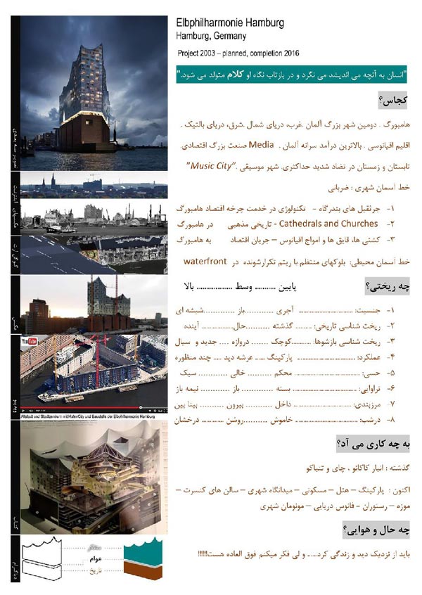 در بخش میانی منظره پانرامیک از شهر هامبورگ در انتظار مخاطبین است. شاید زاویه ای جدید در تجربه مردم از یک شهر کاملا مسطح. یک لابی شهری برای نظاره شهر تاریخی و خفته هامبورگ. در بخش فوقانی یک ریخت شناسی غیر متعارف دیده می شود، چه در تعامل با شهر و چه در تعامل با معماری. تا زمانی که مقاطع این بنا دیده نشود یا حضور و تجربه فضایی محقق نشود، امکان تجسم تالار ارکستر فیلارمونیک با ظرفیت 2150 صندلی غیرممکن است. با دیدن چیدمان منظم طبقاتی پنجره مانندهای جداره شیشه ای تنها بخش سکونتی و هتل را می توان پیش بینی کرد، نه یک تالار به این عظمت در قلب پروژه. در قسمت بازشوها، نه قاب پنجره بلکه تبدیل دیواره ها به پنجره دیده می شود و در قسمتهایی با موج گرفتن دیواره به صورت افقی و عمودی که گویا نتیجه آوای موسیقی درون بناست؛ بنا با شهر سخن می گوید.