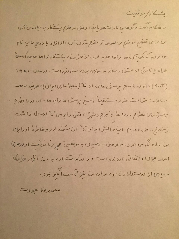 در سال 1381، او در پاسخ پرسش های "ما" (مجله معماری ایران)، هرچند به علت مسافرت نتوانست خود مستقیماً پاسخ پرسش ها را بدهد، در رابطه با پرسش های مطرح در رابطه با "برج و شهر"، متنی را برای "ما" ارسال داشت (مندرج در ش 10+11). این واکنش برای "ما" ارزشمند بود و خاطره ی او را برای من زنده نگه می دارد.