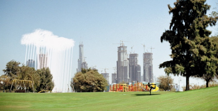 این طرح اززندگی کوچ نشینی که درارتباط تنگاتنگی با خورشید،آب و ماسه می باشد،الهام گرفته شده.وسازه ایست که با شکل افقی خود تضاد زیبایی را با آسمانخراش های عمودی شهرایجاد می کند.این ابرهای رویایی،تصویری بین واقعیت و خیال است.این سازه درارتفاع300 متری دارای 200000 مترمربع مساحت می باشد،که حامل دریاچه،باغ،پلهای دوار،مسیرهای مارپیچ جهت پیاده روی، سالن کنفرانس وزمین ورزش نیزمی باشد. مسیردسترسی به بالا نیزازمیان چند پایه که شیبدارنیستند صورت می گیرد.