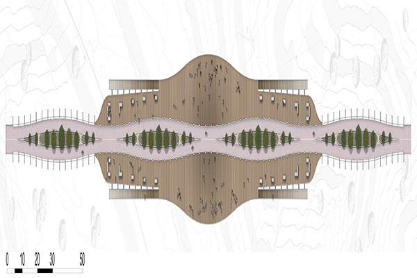 عنوان فضای فعال و پر شور شهری عمل می کند. با توجه به موقعیت منحصر به فرد پل ، در هر سو بر فراز پنج متر بالای پلازای شهری، " عرشه تماشا "