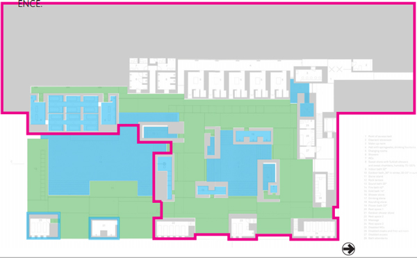 و آب، سنگ را دوست دارد. بیش از هر متریال دیگر. زیرا سنگ آب را در خود نگه می دارد. رخنه کردن نور در محل های منتخب، روشن شدن سنگ، آغاز درخشش آب و اتمسفر مشعشعی که اکنون در آنجا حضور دارد. سنگ های Valser Gneiss (نوعی سنگ شبیه به گرانیت که در کشور سوئیس استخراج می شود)، بدن های انسان ها و منطقه ییلاقی، نقش های اصلی این پروژه را ایفا می کنند. اتاق های ساخته شده از سنگ به جای در تعارض بودن با بدن ها باید از آنها مراقبت کنند. فرم های ملایم، حضور مصالح عالی، سنگ و آب ... هرچه بیشتر به سنگ اعتماد می کنیم و اجازه می دهیم تا نقش اصلی را بازی کند، بیشتر شروع به نمایان کردن لطافت، طرح و ساختار و زیبایی اش می کند. اتاق ها ممکن است که وجود خود را مدیون یک ایده باشند، اما در انتها، آنها از ماده، ماده ای که اغلب به هیچ عنوان مطیع ایده ها نیستند و خواهان بازگشت به ذات خویش اند، به وجود آمده اند