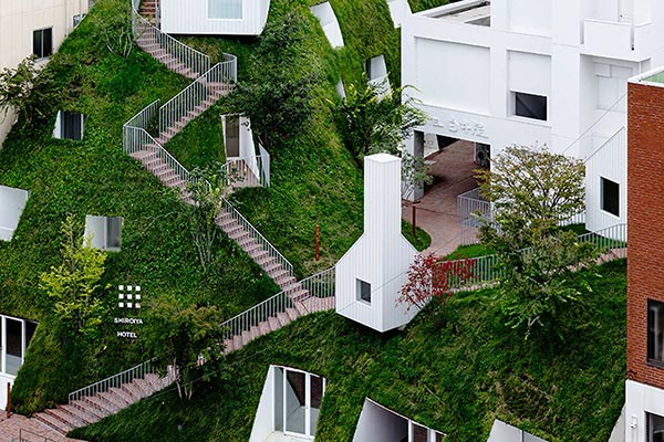 معماران سو فوجیموتو، هتلی در مائباشی را نوسازی کرده اند، طبقات داخلی ساختمان اصلی را برداشته اند و تپه ای سبز که کابین هایی زیستی روی ان مستقر شده اند را اضافه کرده اند. هتل در مرکز شهر قرار دارد و ساختمان اصلی ان متعلق به دهه 1970 میلادی است، ساختمانی که معمارانِ فوجیموتو برای نوسازی اش اقدام کرده اند از سال 2008 بسته و بلااستفاده باقی مانده بود. ایده اصلی پس زمینه طرح، احیای "نشیمنی برای شهر" است، فوجیموتو برای زندگی بخشی به نمای بیرونی ساختمان از تایپوگرافی های هنرمند آمریکایی لارنس واینر استفاده کرده است. به موازات تولید یک اتریوم نیز توانست احیا ایده ی اصلی را نزدیک به تحقق سازد: "گمانمان این بود که برای درک هرگونه پتانسیل ذاتی طرح به چیزی قدرتمند و تاثیرگذار نیاز داریم، از همین رو در همان اغاز فرایند طراحی، تصمیم گرفتیم دیوارها و کف ها را در هر چهار طبقه برچینیم تا یک اتریوم مرکزی غول پیکر ایجاد شود." ساختمان بازسازی شده، که اکنون به "برج میراث" معروف است، شامل قسمت پذیرش هتل، رستوران و سالن پذیرایی در طبقه همکف است و اتاق های مهمان شامل چهار سوئیت است که توسط طراحان معروف در طبقات بالا ایجاد شده. اتریوم بزرگ که در ارتفاع توسط تیرهای بتنی تقطیع شده است، با نور طبیعی که از طریق نورگیرهای سقفی وارد سقف می شود روشن می شود. گیاهان و مبلمانی که در فضاهای عمومی طبقه همکف استقرار پیدا کرده اند، فضایی پیازاْ مانند ایجاد می کنند، در حالی که پرده ها و راه پله ها، تمام قد چشم را در سطوح مختلف و به سمت بالا حرکت می دهند. به گمان معماران:"هنگامی که بازدید کننده از پله ها بالا می رود، تغییرات فضایی را درک می کند، عمق فضا، کشیده می شود و کاهش می یابد و به موازات در همه جهات با هم همْ پوشانی دارند، چراکه خطوط بینایی و جهت بدن آنها در طول مسیر تغییر می کند. . . این تجربه، گذر در یک شهر واقعی را تکرار و تداعی می کند." اتریوم همچنین منقوش به اینستالیشنی است به نام لوله های روشنایی که توسط هنرمند آرژانتینی لئاندرو ارلیچ اجرا شده است که در طراحی ان از رمان شهرهای نامرئیِ ایتالیو کالوینو الهام گرفته است. لئاندرو ارلیچ در تبیین این اینستالیشن می گوید: "یکی از داستانهای این کتاب به ساختمانی ارجاع دارد که برای چشم نامرئی است اما لوله های نوری اش قابل مشاهده اند. . . تلاش من تزریق این جزئیات معماری به عنوان رگ های موجودس نامرئی در کالبد این بنا بوده است." به موازات، برای ایجاد تنوع بصری در اتاق های خواب، فوجیموتو از ارلیچ، جسپر موریسن و میشله دِ لوچی خواسته است تا در کنار خود او چهار اتاق پذیرایی مجموعه را طراحی کنند. یک گذرگاهِ باز که ورودی اصلی هتل را نیز در برمی گیرد، تا برج هریتیج امتداد می یابد و به زمینی می رسد که قبلاً تراسی بوده است مشرف به یکی از شاخه های فرعی رودخانه تُن. این برج با نام برج سبز، اختلاف ارتفاع بین خیابان های دو جبهه ی جلو و عقب سایت را در خود حل می کند. طراحان بر این باورند که:" تلاش ما ایجاد یک منبع انباشت قابل بسط برای ارائه فضای شهری جدید و توسعه سه بعدی مسیر موجود بوده است. . . این پروژه همچنین یک گسترش فضایی پیاده راه محور نیز هست که توسط سطوح منحنی احاطه شده. این فضای شهری تازه رابطه ای بر مبنای تضادهایی مانند جدیدْ قدیمی، خارجْ داخل و معماریْ شهر را در خود نهادینه ساخته." برج سبز دارای پل های آجری برای گذر است که دسترسی به کابین های کوچک حاوی سونا فنلاندی و اینستالیشن های تاتسو میاجیما را نیز فراهم می کند. اتاق های مهمان که در داخل تپه تعبیه شده اند دارای بالکن هایی هستند که به سمت شیب تپه بریده شده اند و به سرنشینان این امکان را می دهند که در فضای سبز اطراف غوطه ور شوند. دامنه های سبز همچنین به مفهوم mebuku یا "جوانه زدن" اشاره می کنند که توسط تاناکا و شهر مائباشی برای توصیف چشم انداز جهت توسعه مجدد و متداوم شهر به کار می روند.