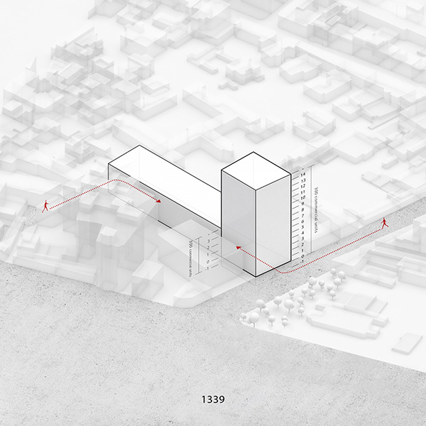 می شد که حجم را می شکافت و به بام ساختمان 5 طبقه شمالی می رسید و ارتباط درونی