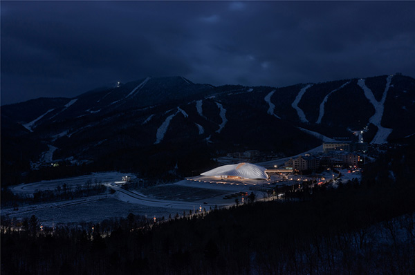 ساختار سقف از شکل کوه های پوشیده از برف الهام گرفته شده است در حالی که بافت