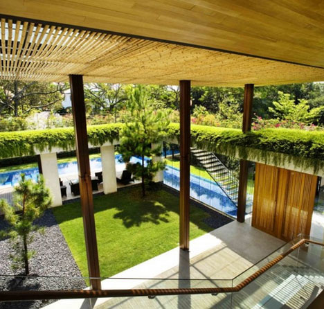 شما در این خانه خیره کننده هیچ مشکلی برای تماشای جنگل از میان درختان ندارید ، چه در فضای داخلی و چه در فضای خارجی .این خانه مدرن دارای پلانی باز ، پشت بامی سبز ، پاسیو در فضای باز ، ایوانی بسیط و استخر شنای و فضای اطراف آن است . حیاط سبز مرکزی ، زندگی راحتی به فضاهای درونی خانه به ارمغان می آورد ، با گیاهانی آویزان شده از دیوارهای آن ، درختانی برآمده از میان چمن ها و بوته ها که خانه ای برای گذراندن تعطیلات ساکنان آن می باشد . مجموعه ای از ستون های مستطیل شکل سنگی با برش هایی خشن بر روی آن ، یک حصار مرزی نیمه شفاف و مطمئن به وجود می آورند . شیارهایی با ایجاد دید محدود بین هر قسمت عمودی استفاده شده . برای درب گاراژ و ورودی میله هایی از بامبو ، شکاف هایی بین سنگ ها را پر کرده . تراس طبقه دوم با سقفی کشیده و دنج احاطه شده که اتاق خواب ها و سالن در این طبقه هستند . فضای زیر زمین دارای استخر زیباست که با شیشه ای از فضای زندگی در این طبقه جدا شده . طراح این خانه Guz Architectsalive بوده است .